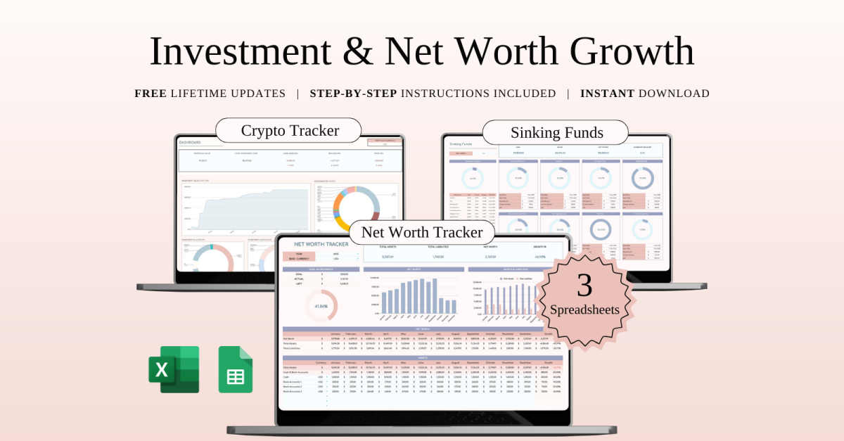 Investment and Net Worth Growth | Spreadsheet Templates Excel and Google Sheets This bundle contains 3 key spreadsheets designed to help you manage your finances with ease. Whether you want to track your net worth, keep tabs on your crypto portfolio, or save for future expenses, this toolkit is a …