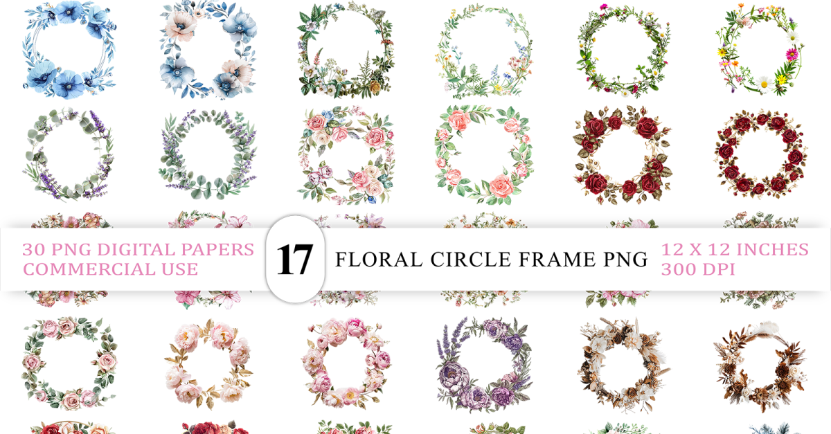 30 Feminine Floral Circle Frame PNG Bundle | Premium Quality | Commercial Use Ready Elevate your design projects with this collection of soft romantic floral PNG frames. Featuring gentle pastel tones, peonies, roses, and wildflowers arranged in circular compositions, Each design is high-resolution with transparent backgrounds, allowing seamless integration into …