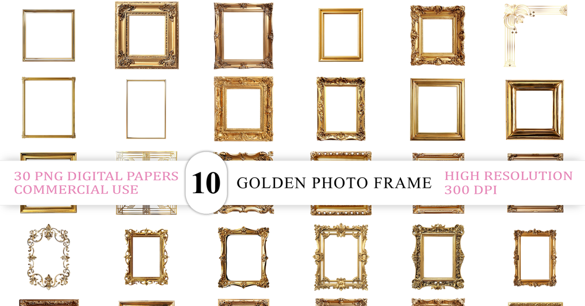 30 Elegant Golden Photo Frame PNG Bundle | Premium Quality | Commercial Use Ready Enhance your digital and print creations with this luxurious 30 Golden Photo Frame PNG Bundle. Each frame features high-resolution quality with transparent centers. What You Get: ✔ 30 Unique Elegant Golden Photo Frame PNG Digital Paper …