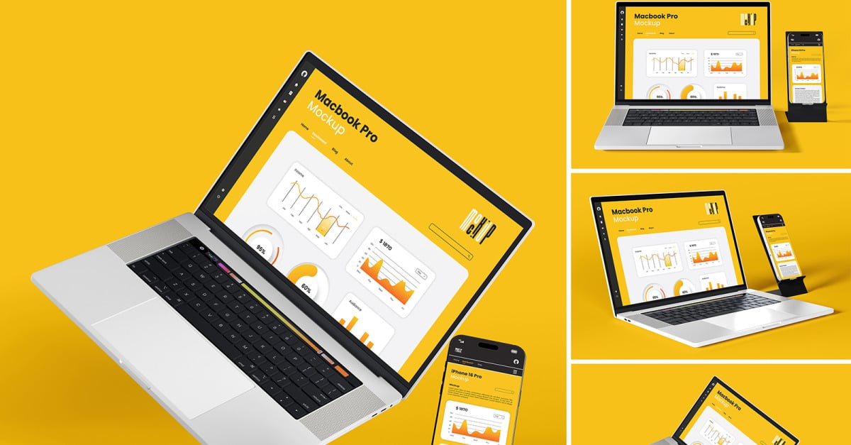 MacBook & iPhone Mockup Sets – Realistic Apple Device PSD Templates for UI, App, and Website Showcase Showcase your designs with these high-quality MacBook & iPhone Mockups. Easy to use with Smart Objects—just drag and drop your artwork. All color elements are fully editable, and each object is separated from …