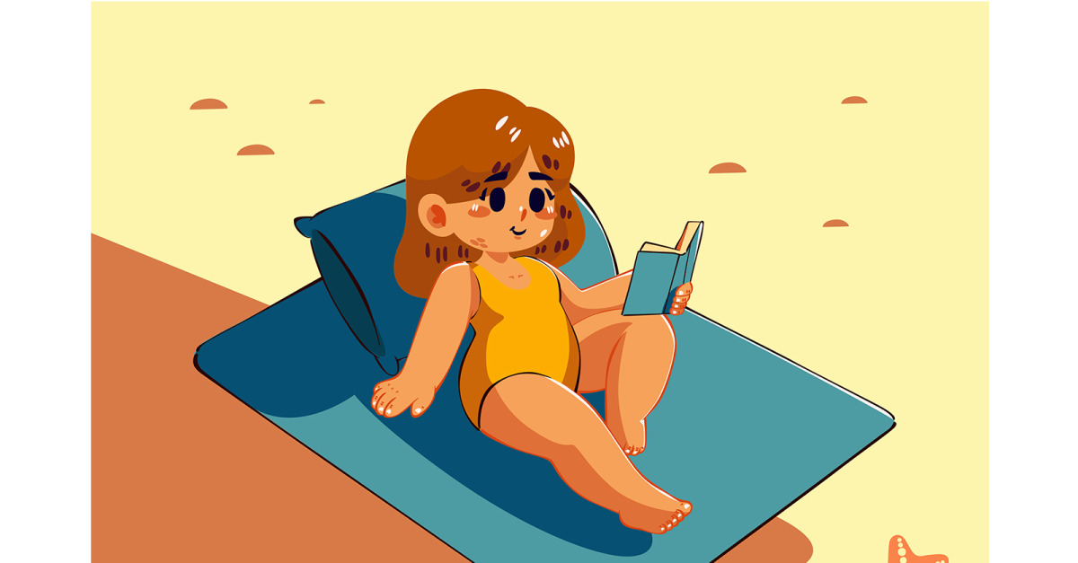 File Included : AI (CS6)EPS10Image 4000 x 3000 (px) **Escape to a relaxing beach day with this serene illustration featuring a girl reading a book against a beautiful beach background. Perfect for unwinding and finding some peace** **This illustration captures a peaceful moment by the seaside. A girl is lying …