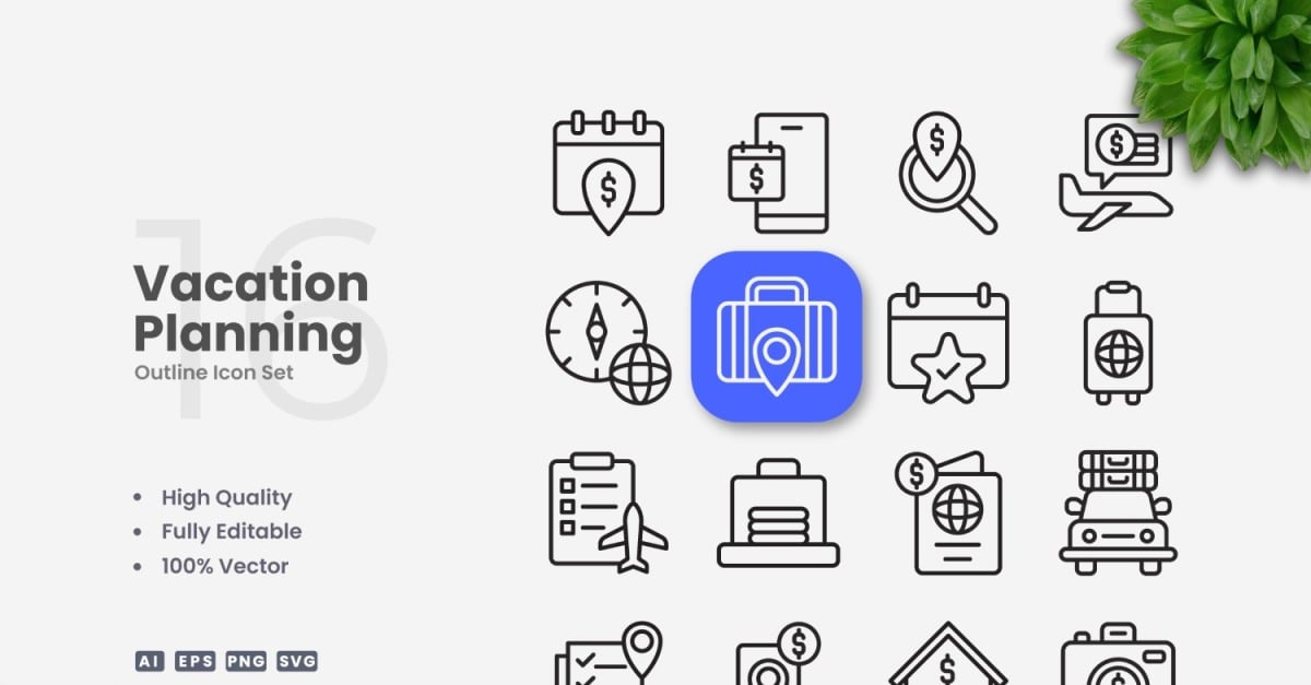 Set of 16 Vacation Planning Outline Icons | Simple and clean design, perfect for websites, mobile apps, books, social media, infographics, flyer, print, banners, posters and many more. To resize or change color you can easily edit on vector software like Adobe Illustrator and CorelDRAW. Features : High Quality Design100% Vector100% …